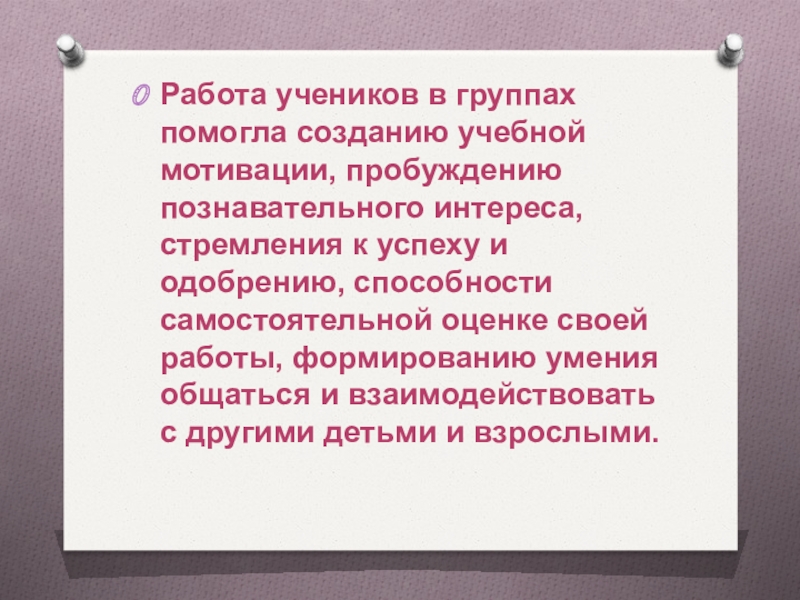 Работа учеников в группах помогла созданию учебной мотивации, пробуждению познавательного интереса,