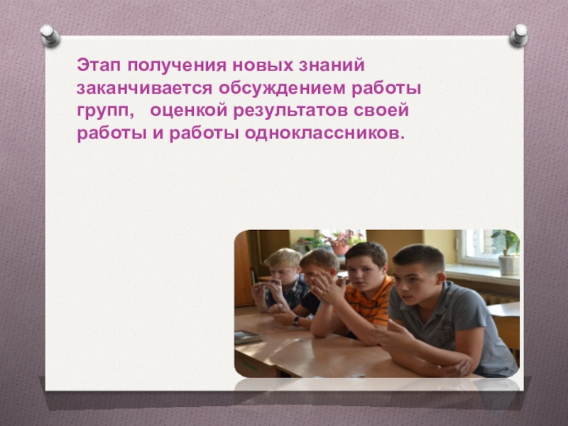 Этап получения новых знаний заканчивается обсуждением работы групп, оценкой результатов