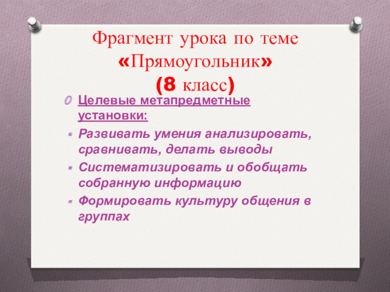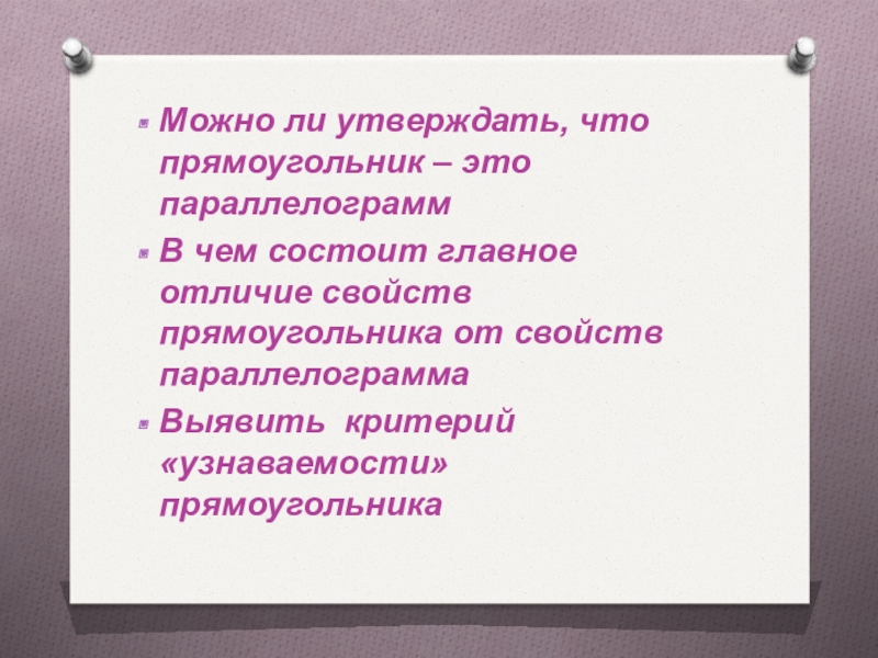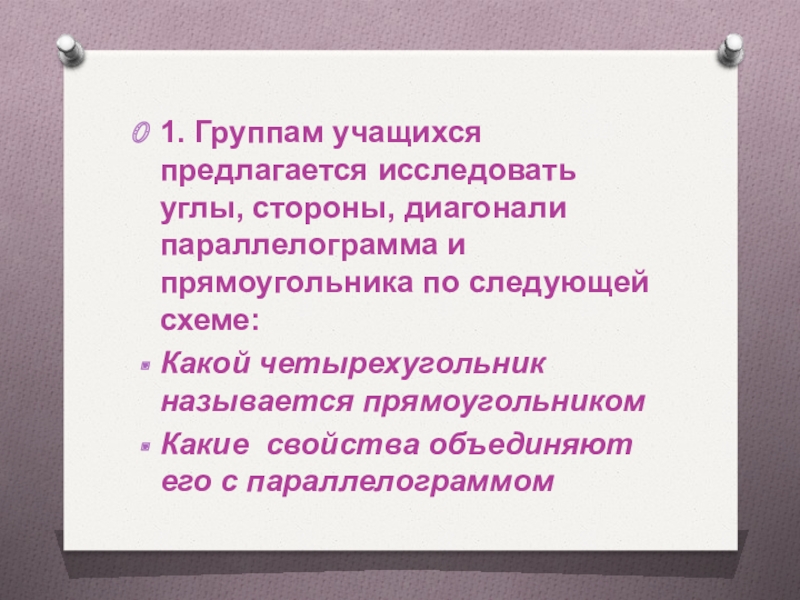 1. Группам учащихся предлагается исследовать углы, стороны, диагонали параллелограмма и прямоугольника