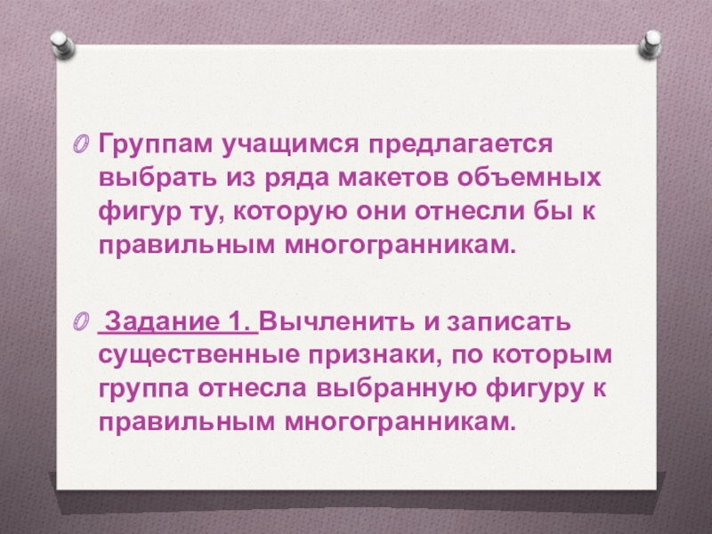 Задание 1. Вычленить и записать существенные признаки, по которым группа отнесла выбранную фигуру к правильным многогранникам.