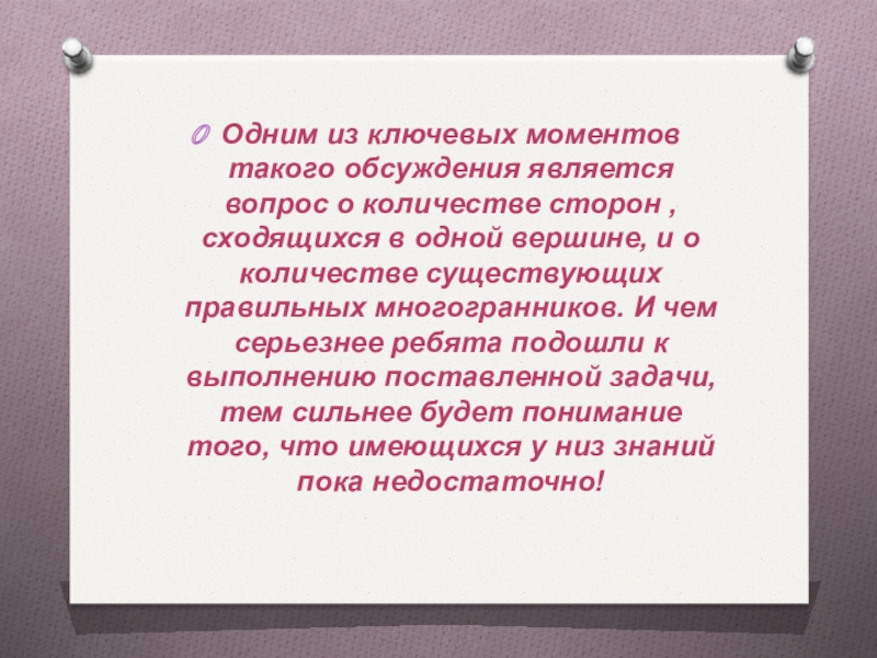 , сходящихся в одной вершине, и о количестве существующих правильных многогранников. И чем серьезнее ребята подошли к выполнению поставленной задачи, тем сильнее будет понимание того, что имеющихся у низ знаний пока недостаточно!