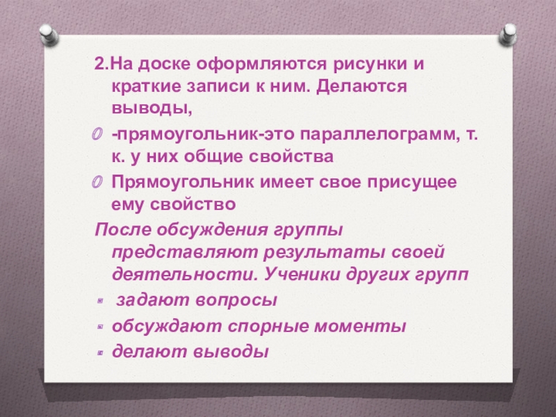 После обсуждения группы представляют результаты своей деятельности. Ученики других групп