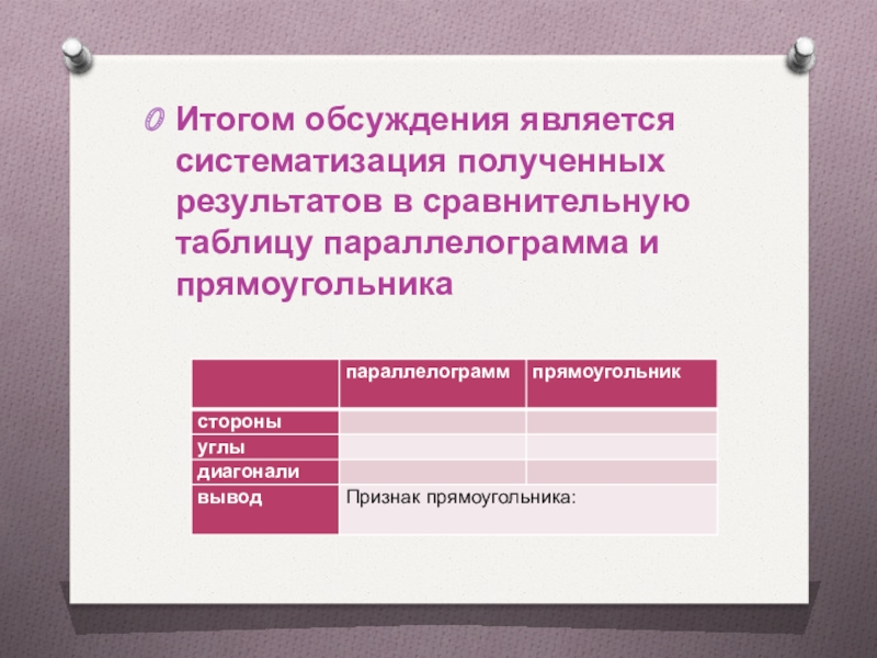 Итогом обсуждения является систематизация полученных результатов в сравнительную таблицу параллелограмма и