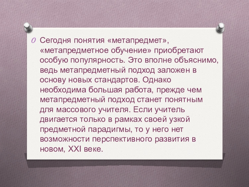Сегодня понятия «метапредмет», «метапредметное обучение» приобретают особую популярность. Это вполне объяснимо,