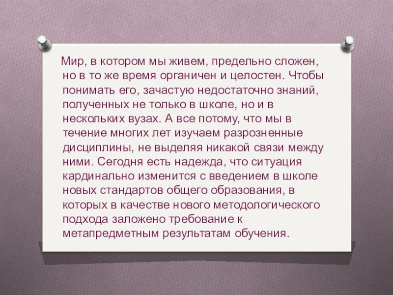 то же время органичен и целостен. Чтобы понимать его, зачастую недостаточно знаний, полученных не только в школе, но и в нескольких вузах. А все потому, что мы в течение многих лет изучаем разрозненные дисциплины, не выделяя никакой связи между ними. Сегодня есть надежда, что ситуация кардинально изменится с введением в школе новых стандартов общего образования, в которых в качестве нового методологического подхода заложено требование к метапредметным результатам обучения.