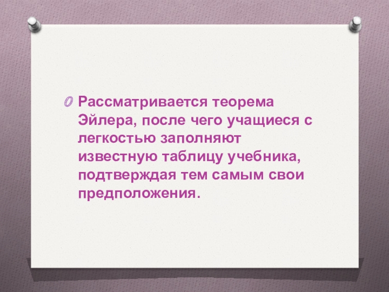 Рассматривается теорема Эйлера, после чего учащиеся с легкостью заполняют известную таблицу