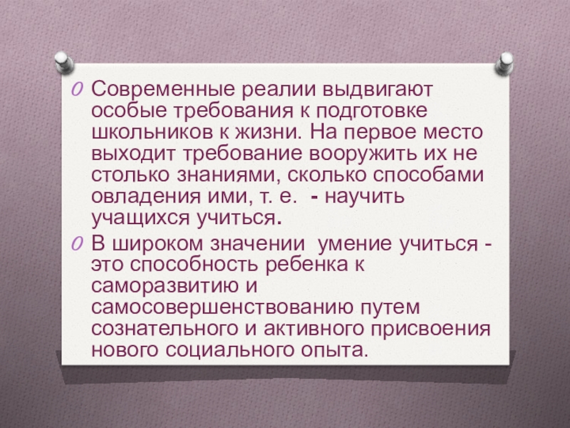 первое место выходит требование вооружить их не столько знаниями, сколько способами овладения ими, т. е. - научить учащихся учиться.