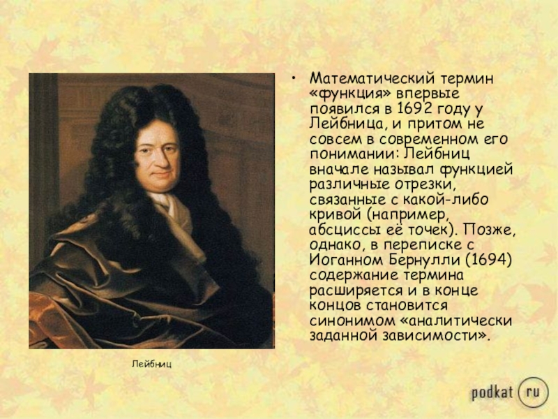 притом не совсем в современном его понимании: Лейбниц вначале называл функцией различные отрезки, связанные с какой-либо кривой (например, абсциссы её точек). Позже, однако, в переписке с Иоганном Бернулли (1694) содержание термина расширяется и в конце концов становится синонимом «аналитически заданной зависимости».