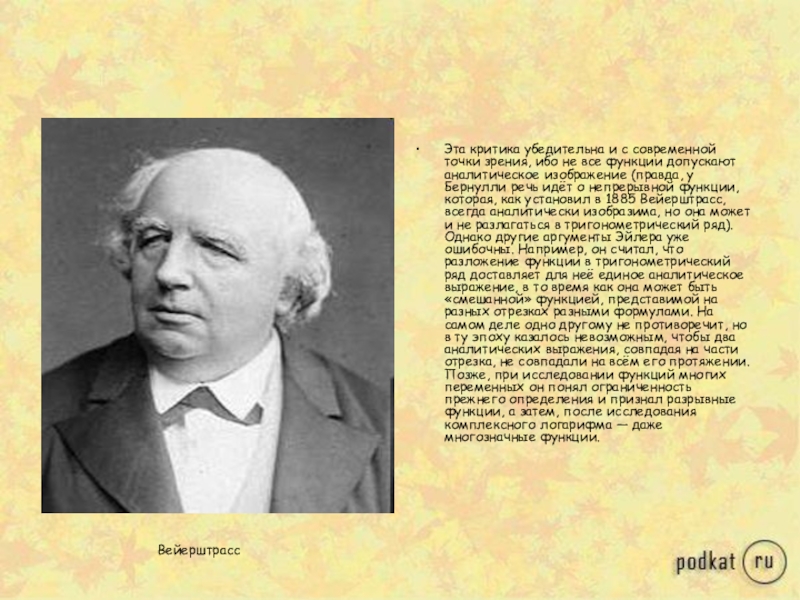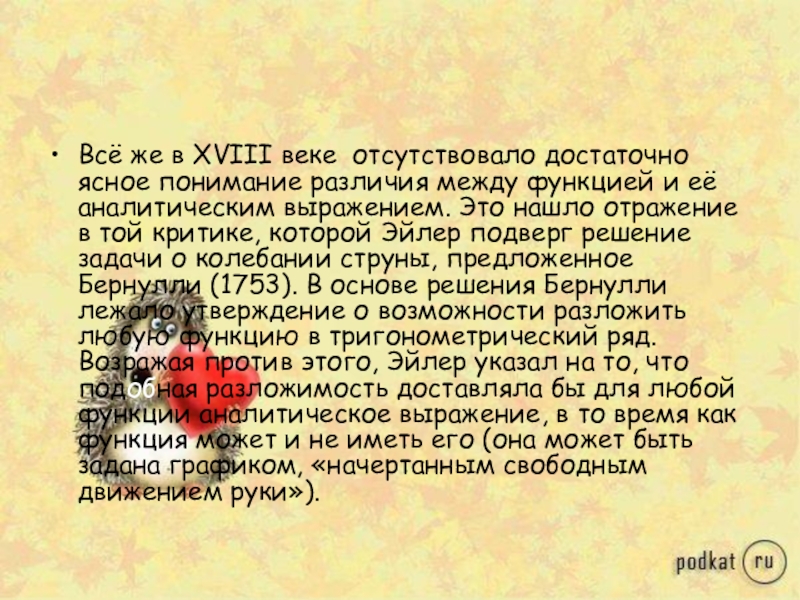 функции допускают аналитическое изображение (правда, у Бернулли речь идёт о непрерывной функции, которая, как установил в 1885 Вейерштрасс, всегда аналитически изобразима, но она может и не разлагаться в тригонометрический ряд). Однако другие аргументы Эйлера уже ошибочны. Например, он считал, что разложение функции в тригонометрический ряд доставляет для неё единое аналитическое выражение, в то время как она может быть «смешанной» функцией, представимой на разных отрезках разными формулами. На самом деле одно другому не противоречит, но в ту эпоху казалось невозможным, чтобы два аналитических выражения, совпадая на части отрезка, не совпадали на всём его протяжении. Позже, при исследовании функций многих переменных он понял ограниченность прежнего определения и признал разрывные функции, а затем, после исследования комплексного логарифма — даже многозначные функции.