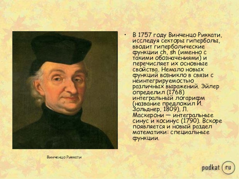 функции ch, sh (именно с такими обозначениями) и перечисляет их основные свойства. Немало новых функций возникло в связи с неинтегрируемостью различных выражений. Эйлер определил (1768) интегральный логарифм (название предложил И. Зольднер, 1809), Л. Маскерони — интегральные синус и косинус (1790). Вскоре появляется и новый раздел математики: специальные функции.