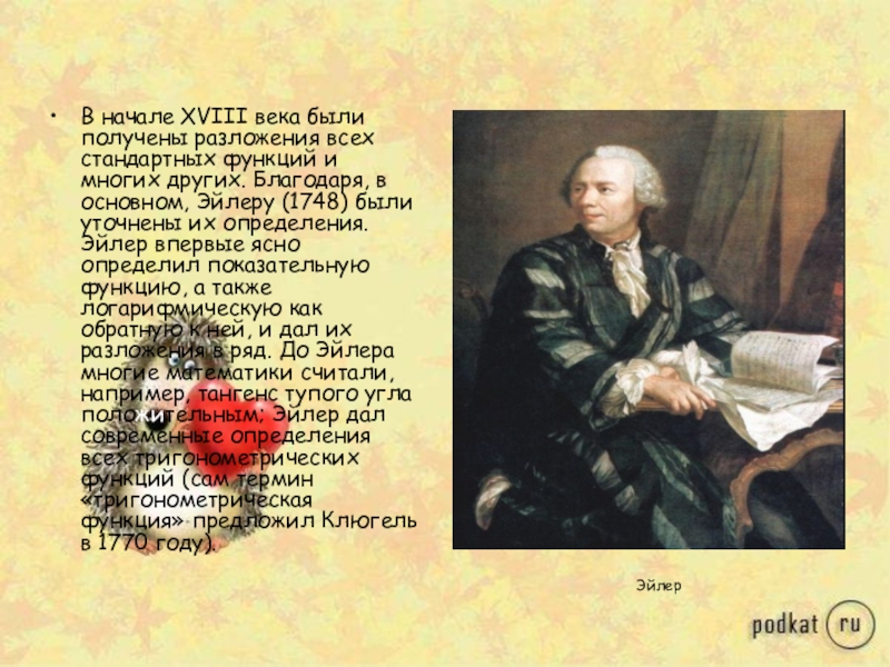 многих других. Благодаря, в основном, Эйлеру (1748) были уточнены их определения. Эйлер впервые ясно определил показательную функцию, а также логарифмическую как обратную к ней, и дал их разложения в ряд. До Эйлера многие математики считали, например, тангенс тупого угла положительным; Эйлер дал современные определения всех тригонометрических функций (сам термин «тригонометрическая функция» предложил Клюгель в 1770 году).