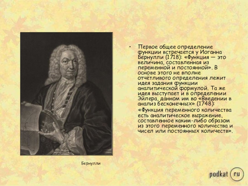 Первое общее определение функции встречается у Иоганна Бернулли (1718): «Функция — это