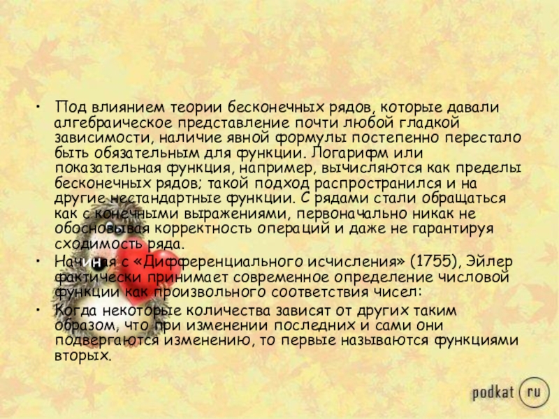 гладкой зависимости, наличие явной формулы постепенно перестало быть обязательным для функции. Логарифм или показательная функция, например, вычисляются как пределы бесконечных рядов; такой подход распространился и на другие нестандартные функции. С рядами стали обращаться как с конечными выражениями, первоначально никак не обосновывая корректность операций и даже не гарантируя сходимость ряда.