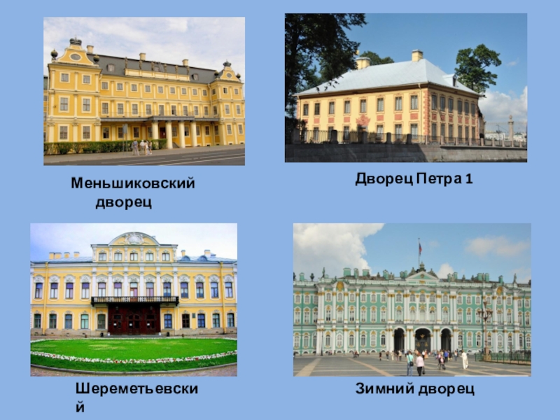 Меньшиковский        дворецДворец Петра 1Шереметьевский     дворецЗимний дворец