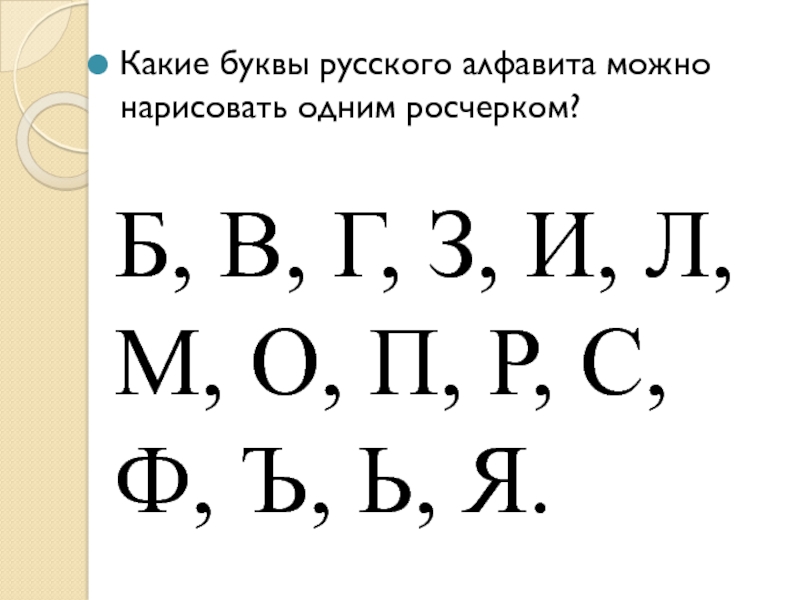 Слайд 7Какие буквы русского алфавита можно нарисовать одним росчерком?