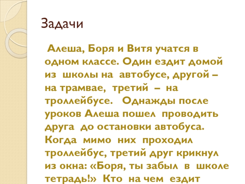 из школы на автобусе, другой – на трамвае, третий – на троллейбусе. Однажды после уроков Алеша пошел проводить друга до остановки автобуса. Когда мимо них проходил троллейбус, третий друг крикнул из окна: «Боря, ты забыл в школе тетрадь!» Кто на чем ездит домой?
