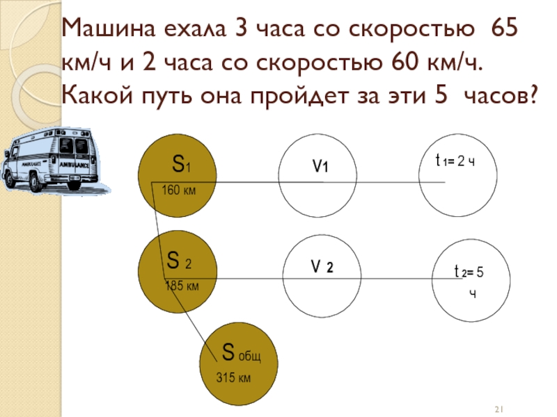 Слайд 21Машина ехала 3 часа со скоростью 65 км/ч и 2 часа