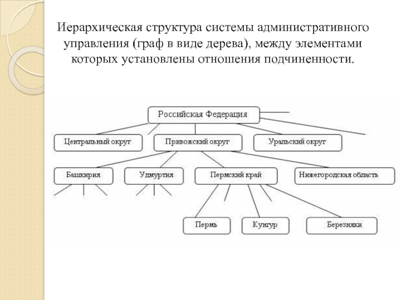 Слайд 28Иерархическая структура системы административного управления (граф в виде дерева), между элементами