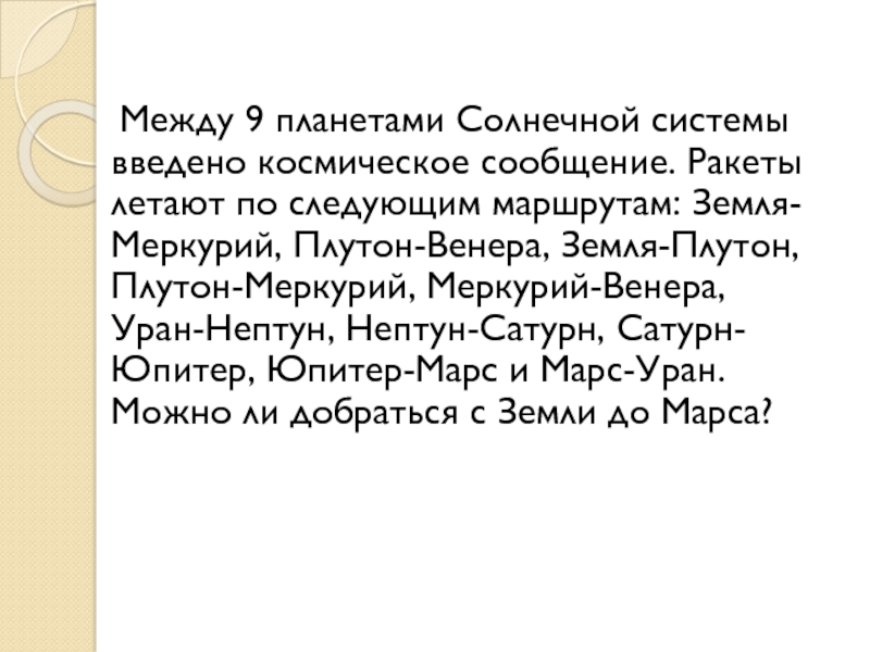 следующим маршрутам: Земля-Меркурий, Плутон-Венера, Земля-Плутон, Плутон-Меркурий, Меркурий-Венера, Уран-Нептун, Нептун-Сатурн, Сатурн-Юпитер, Юпитер-Марс и Марс-Уран. Можно ли добраться с Земли до Марса?