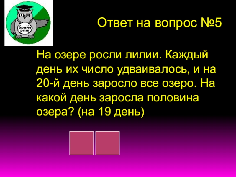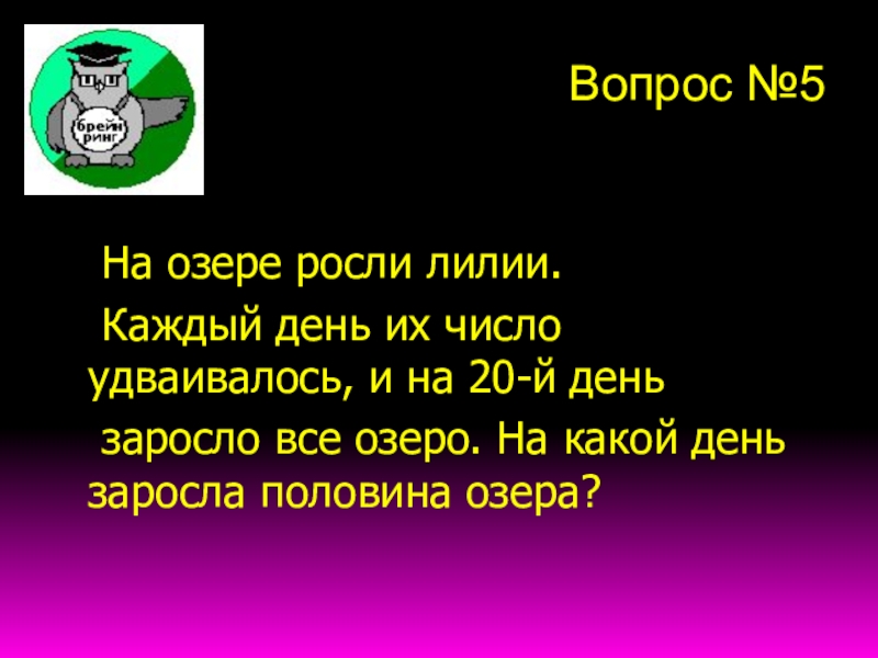 их число удваивалось, и на 20-й день заросло все озеро. На какой день заросла половина озера? (на 19 день)