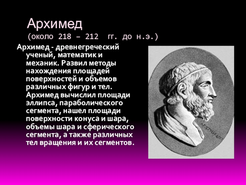 и механик. Развил методы нахождения площадей поверхностей и объемов различных фигур и тел. Архимед вычислил площади эллипса, параболического сегмента, нашел площади поверхности конуса и шара, объемы шара и сферического сегмента, а также различных тел вращения и их сегментов.