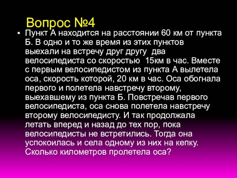 В одно и то же время из этих пунктов выехали на встречу друг другу два велосипедиста со скоростью 15км в час. Вместе с первым велосипедистом из пункта А вылетела оса, скорость которой, 20 км в час. Оса обогнала первого и полетела навстречу второму, выехавшему из пункта Б. Повстречав первого велосипедиста, оса снова полетела навстречу второму велосипедисту. И так продолжала летать вперед и назад до тех пор, пока велосипедисты не встретились. Тогда она успокоилась и села одному из них на кепку. Сколько километров пролетела оса?