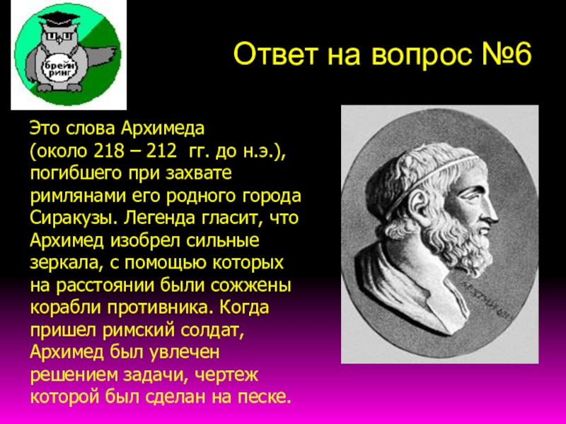 гг. до н.э.), погибшего при захвате римлянами его родного города Сиракузы. Легенда гласит, что Архимед изобрел сильные зеркала, с помощью которых на расстоянии были сожжены корабли противника. Когда пришел римский солдат, Архимед был увлечен решением задачи, чертеж которой был сделан на песке.