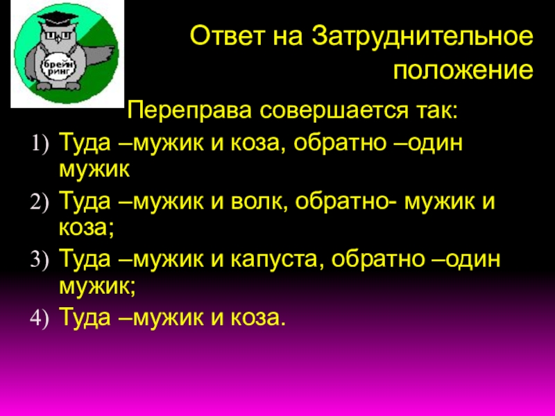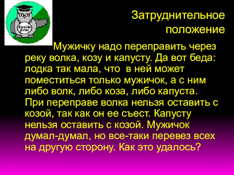 через реку волка, козу и капусту. Да вот беда: лодка так мала, что в ней может поместиться только мужичок, а с ним либо волк, либо коза, либо капуста. При переправе волка нельзя оставить с козой, так как он ее съест. Капусту нельзя оставить с козой. Мужичок думал-думал, но все-таки перевез всех на другую сторону. Как это удалось?