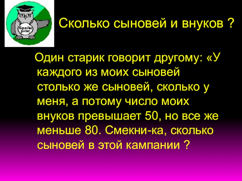 каждого из моих сыновей столько же сыновей, сколько у меня, а потому число моих внуков превышает 50, но все же меньше 80. Смекни-ка, сколько сыновей в этой кампании ?
