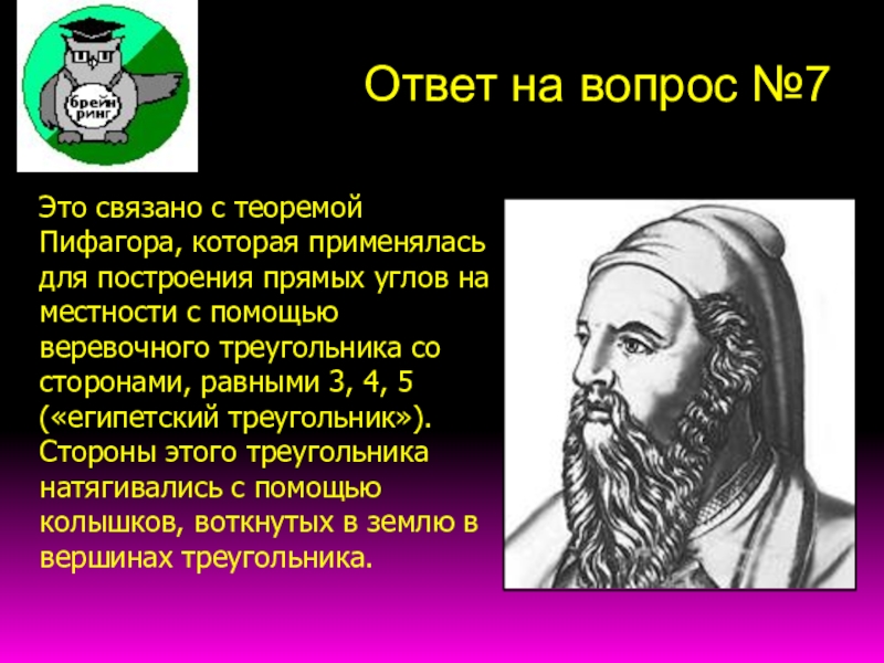 применялась для построения прямых углов на местности с помощью веревочного треугольника со сторонами, равными 3, 4, 5 («египетский треугольник»). Стороны этого треугольника натягивались с помощью колышков, воткнутых в землю в вершинах треугольника.