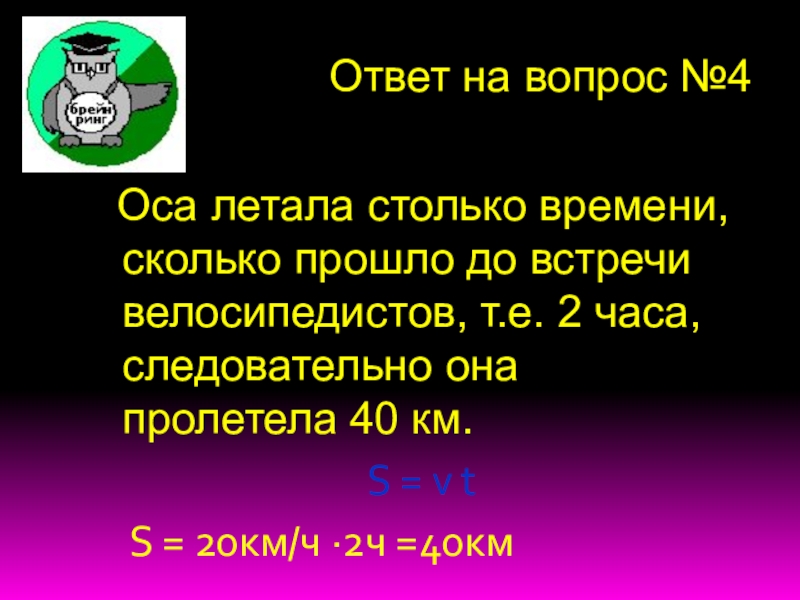 встречи велосипедистов, т.е. 2 часа, следовательно она пролетела 40 км.