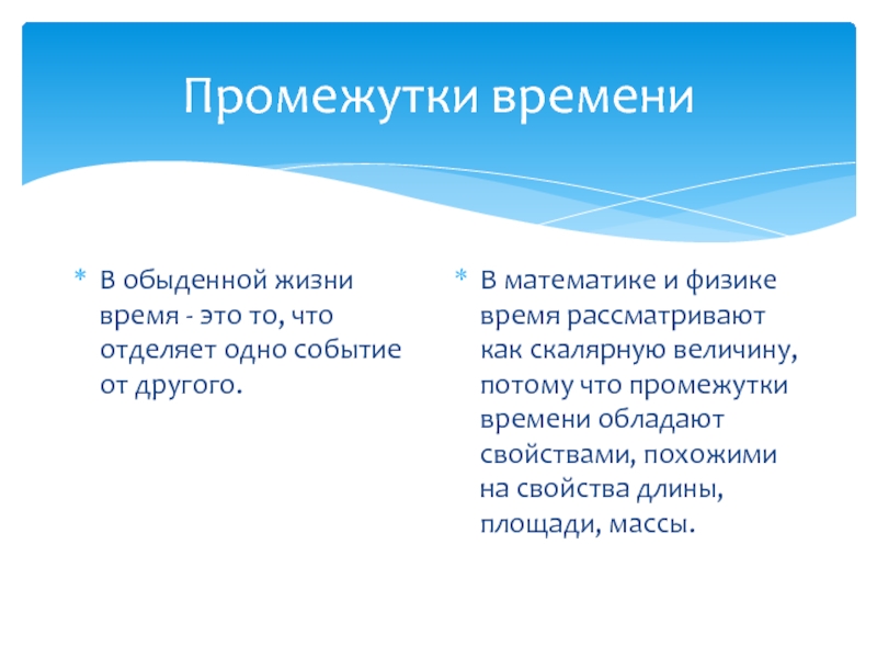 В математике и физике время рассматривают как скалярную величину, потому что промежутки времени обладают свойствами, похожими на свойства длины, площади, массы.