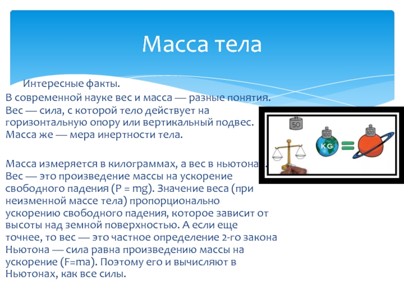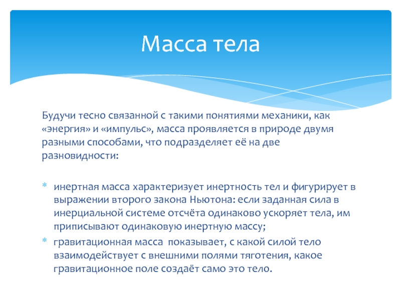 Масса тела - основная механическая величина, определяющая величину ускорения, сообщаемого телу данной силой.
