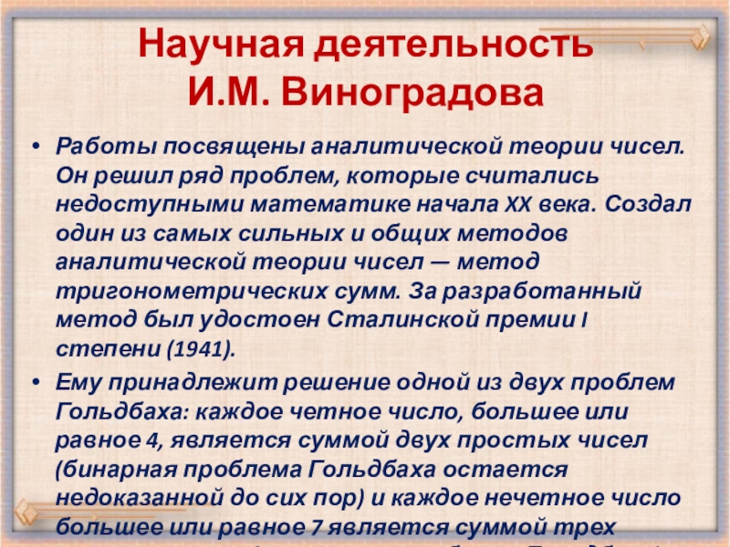 проблем, которые считались недоступными математике начала XX века. Создал один из самых сильных и общих методов аналитической теории чисел — метод тригонометрических сумм. За разработанный метод был удостоен Сталинской премии I степени (1941).