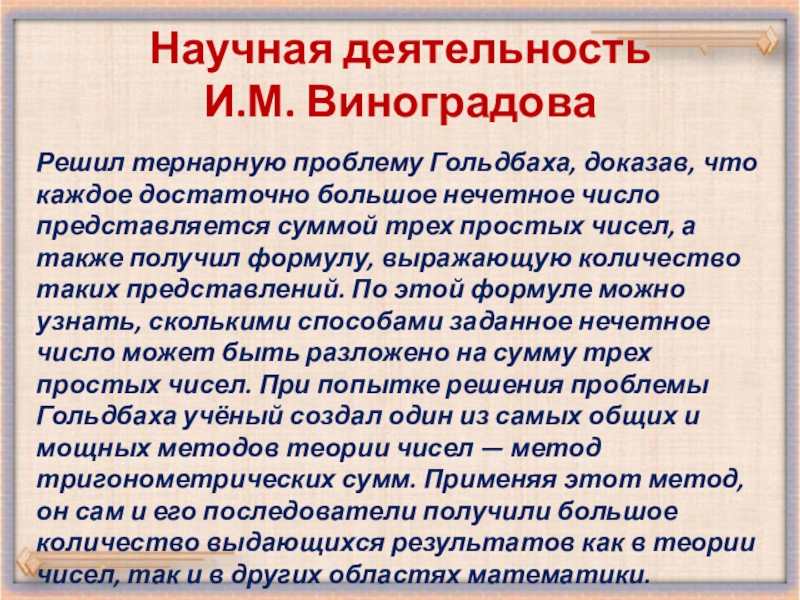 большое нечетное число представляется суммой трех простых чисел, а также получил формулу, выражающую количество таких представлений. По этой формуле можно узнать, сколькими способами заданное нечетное число может быть разложено на сумму трех простых чисел. При попытке решения проблемы Гольдбаха учёный создал один из самых общих и мощных методов теории чисел — метод тригонометрических сумм. Применяя этот метод, он сам и его последователи получили большое количество выдающихся результатов как в теории чисел, так и в других областях математики.