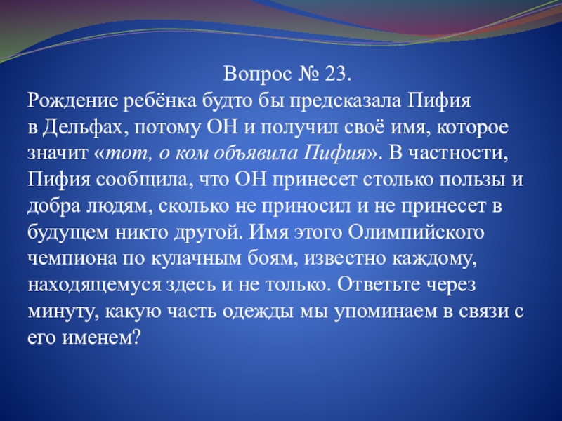 и получил своё имя, которое значит «тот, о ком объявила Пифия». В частности, Пифия сообщила, что ОН принесет столько пользы и добра людям, сколько не приносил и не принесет в будущем никто другой. Имя этого Олимпийского чемпиона по кулачным боям, известно каждому, находящемуся здесь и не только. Ответьте через минуту, какую часть одежды мы упоминаем в связи с его именем?