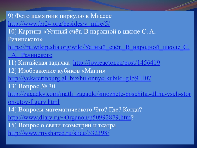 15) Вопрос о связи геометрии и театра http://www.myshared.ru/slide/332398/