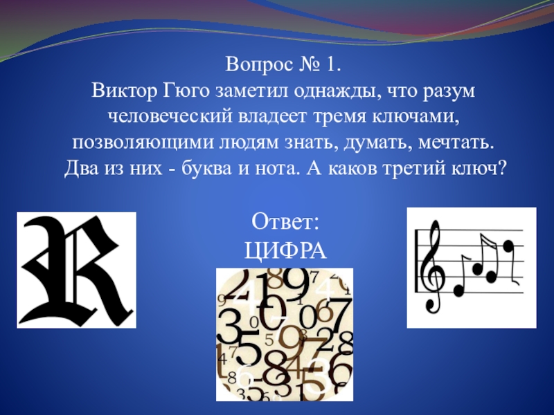 Виктор Гюго заметил однажды, что разум человеческий владеет тремя ключами, позволяющими людям знать, думать, мечтать. Два из них - буква и нота. А каков третий ключ?