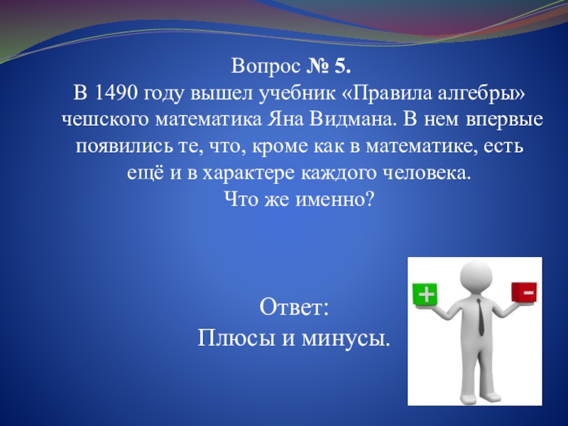 В 1490 году вышел учебник «Правила алгебры» чешского математика Яна Видмана. В нем впервые появились те, что, кроме как в математике, есть ещё и в характере каждого человека. Что же именно?