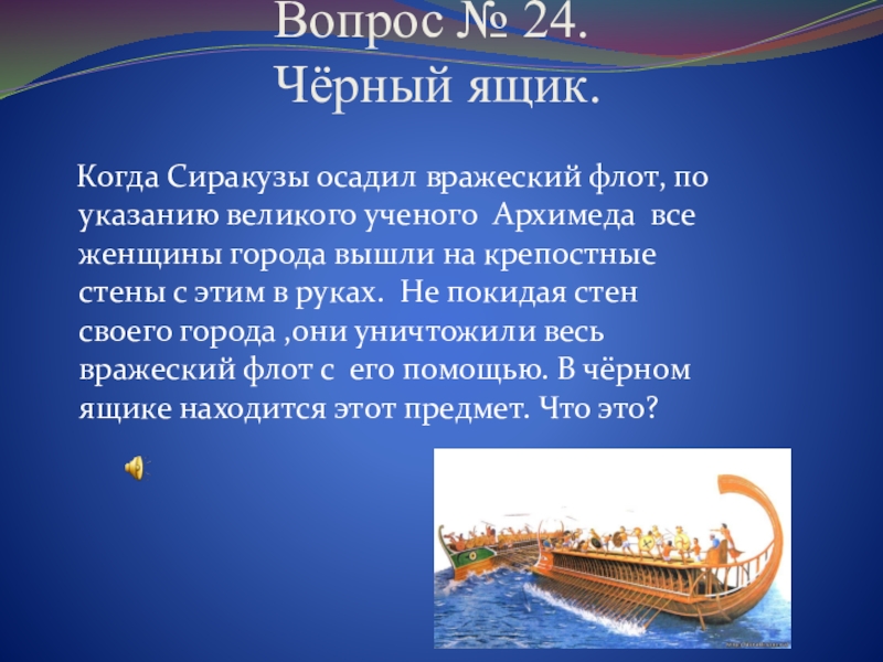Когда Сиракузы осадил вражеский флот, по указанию великого ученого Архимеда все женщины города вышли на крепостные стены с этим в руках. Не покидая стен своего города ,они уничтожили весь вражеский флот с его помощью. В чёрном ящике находится этот предмет. Что это?