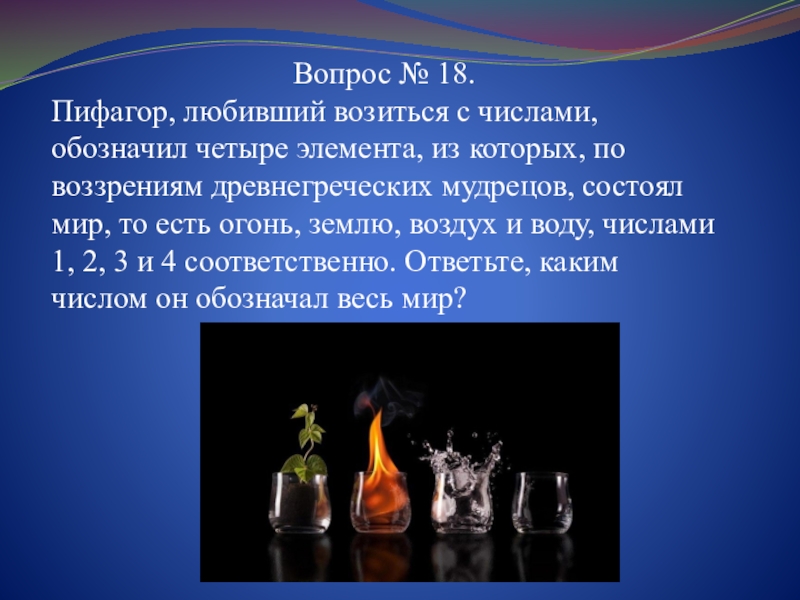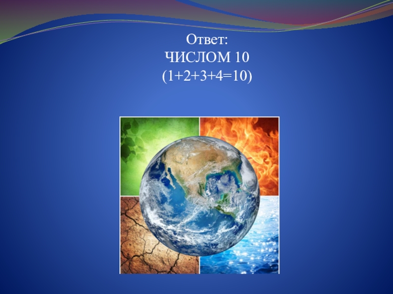 которых, по воззрениям древнегреческих мудрецов, состоял мир, то есть огонь, землю, воздух и воду, числами 1, 2, 3 и 4 соответственно. Ответьте, каким числом он обозначал весь мир?