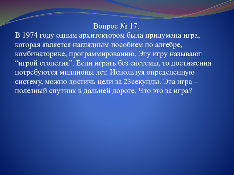 является наглядным пособием по алгебре, комбинаторике, программированию. Эту игру называют “игрой столетия”. Если играть без системы, то достижения потребуются миллионы лет. Используя определенную систему, можно достичь цели за 23секунды. Эта игра – полезный спутник в дальней дороге. Что это за игра?
