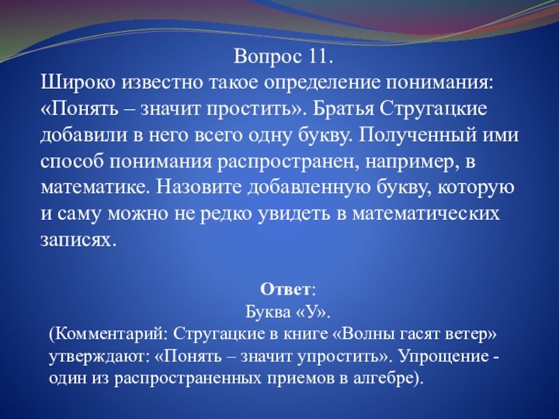 (Комментарий: Стругацкие в книге «Волны гасят ветер» утверждают: «Понять – значит упростить». Упрощение - один из распространенных приемов в алгебре).