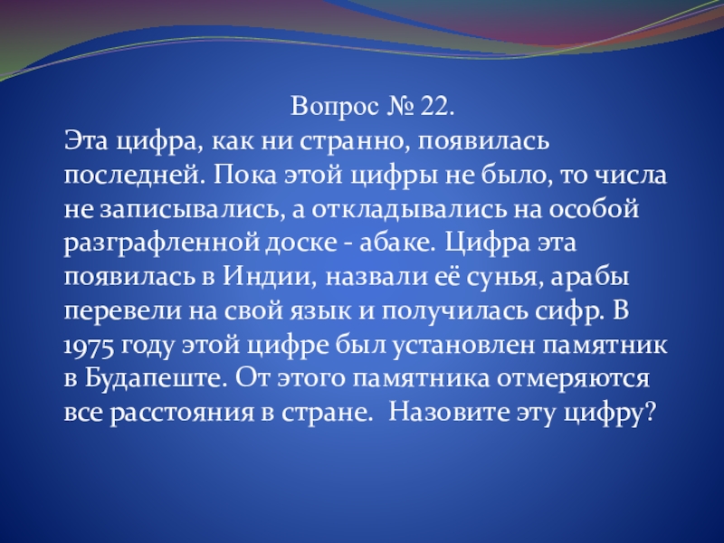 этой цифры не было, то числа не записывались, а откладывались на особой разграфленной доске - абаке. Цифра эта появилась в Индии, назвали её сунья, арабы перевели на свой язык и получилась сифр. В 1975 году этой цифре был установлен памятник в Будапеште. От этого памятника отмеряются все расстояния в стране. Назовите эту цифру?
