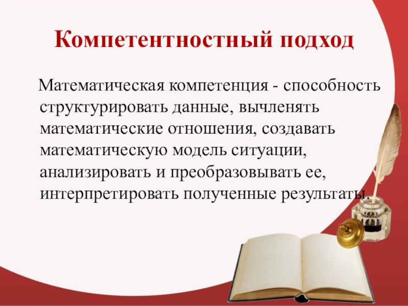 Компетентностный подход  Математическая компетенция - способность структурировать данные, вычленять математические отношения, создавать математическую модель ситуации, анализировать