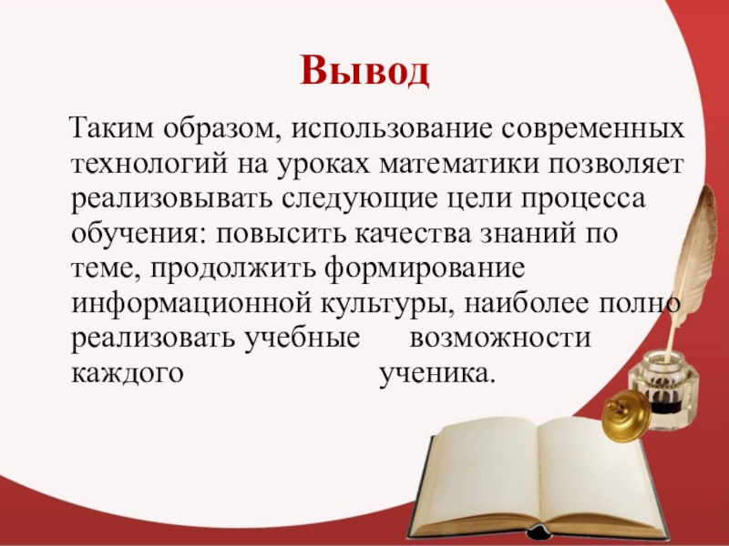 Вывод  Таким образом, использование современных технологий на уроках математики позволяет реализовывать следующие цели процесса обучения: повысить