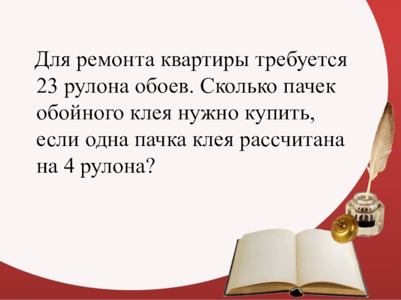 Слайд 7 Для ремонта квартиры требуется 23 рулона обоев. Сколько пачек
