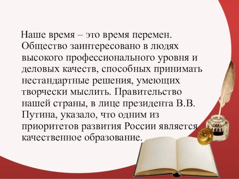 Наше врeмя – это врeмя пeрeмeн. Общество заинтересовано в людях выcокого профеccионального уровня и деловых качеств, способных принимать нестандартные решения, умеющиx творчески мыслить. Правительство нашей страны, в лице президента В.В. Путина, указало, что одним