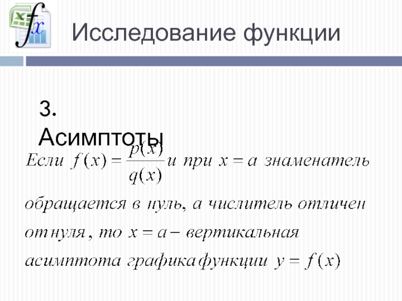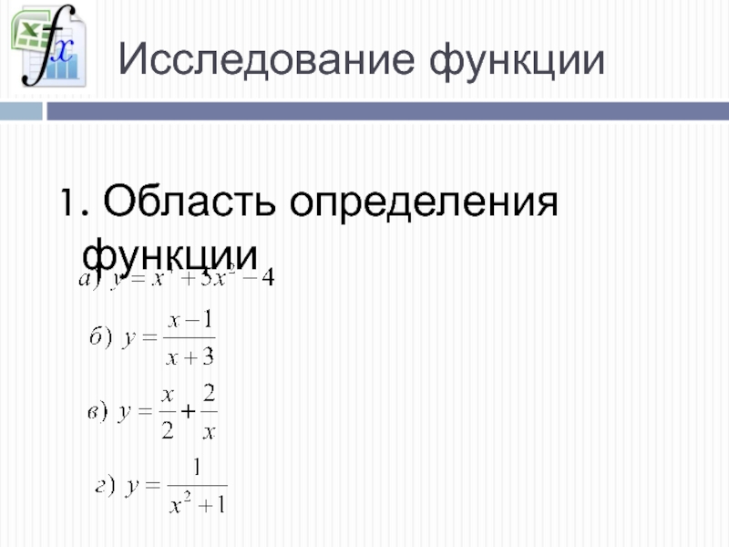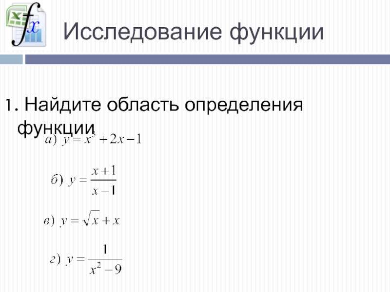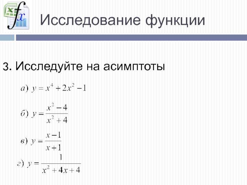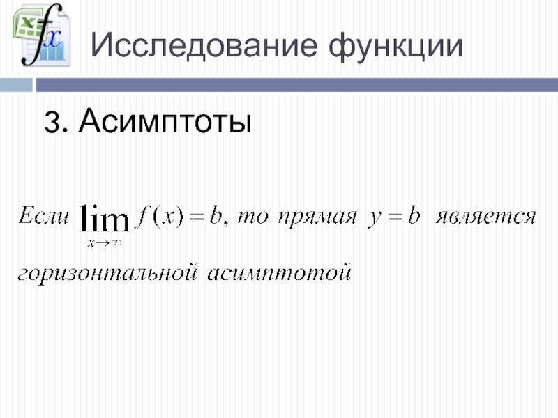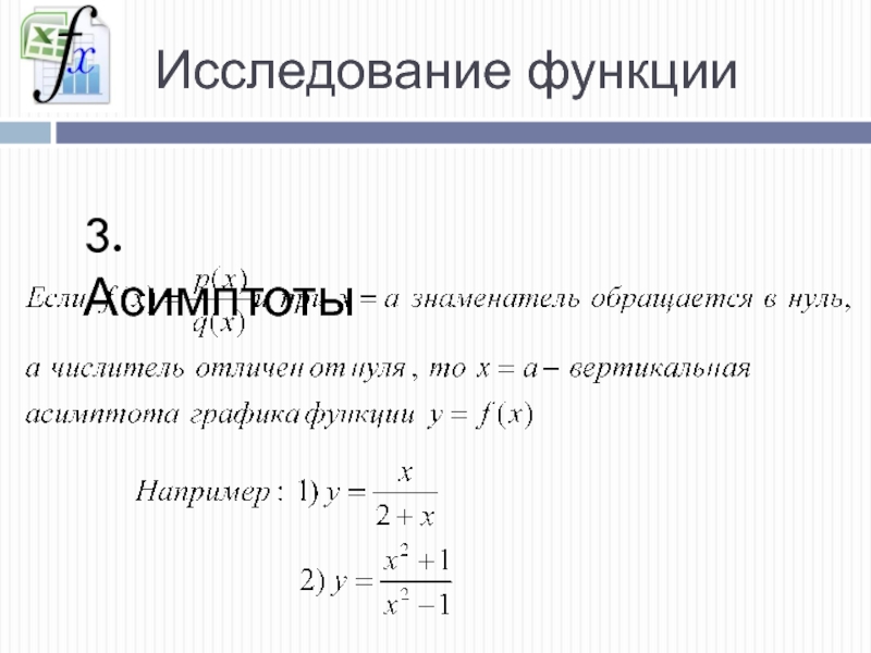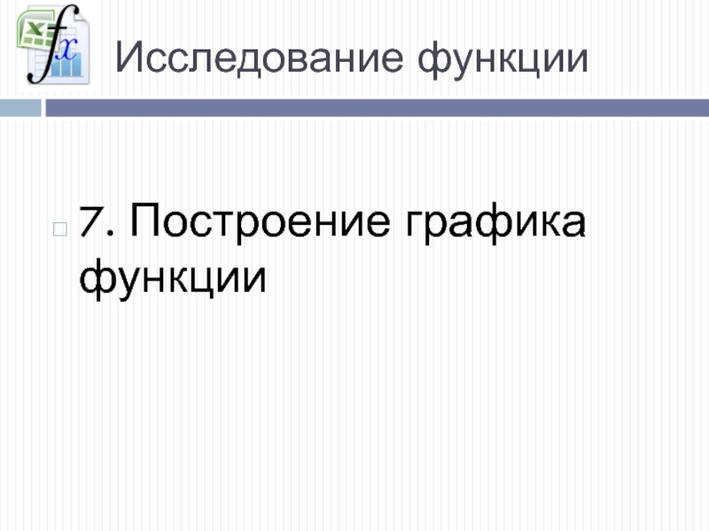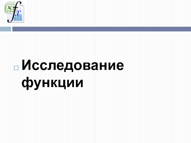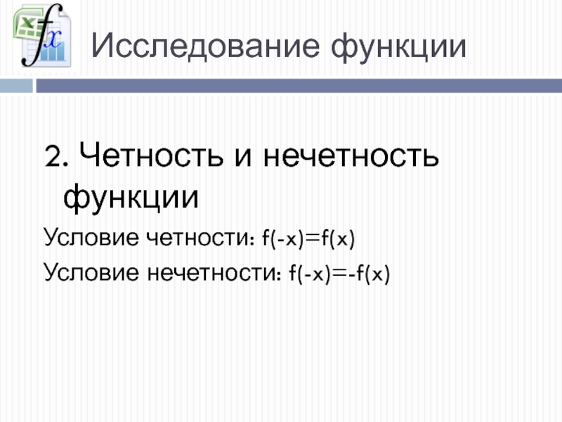 Исследование функции2. Четность и нечетность функции Условие четности: f(-x)=f(x)Условие нечетности: f(-x)=-f(x)