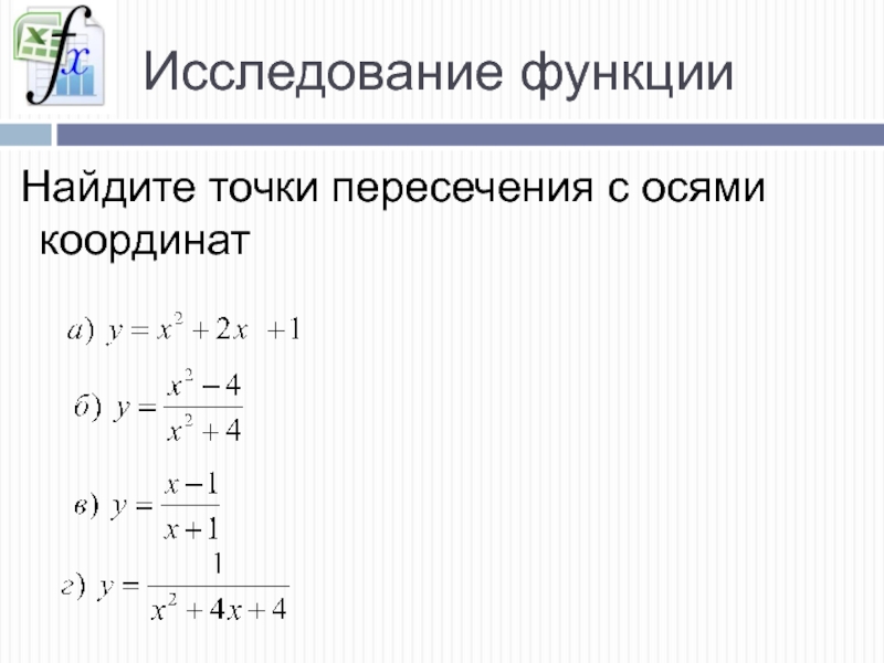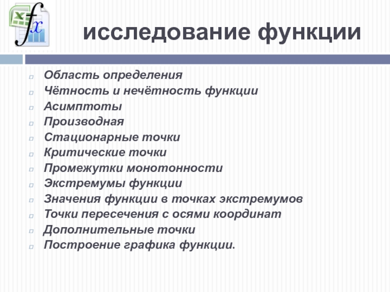 исследование функцииОбласть определенияЧётность и нечётность функцииАсимптотыПроизводнаяСтационарные точкиКритические точкиПромежутки монотонностиЭкстремумы функцииЗначения функции в точках